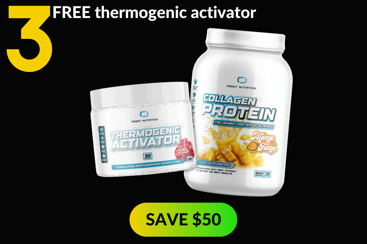 - Purchase Reset Nutrition’s Collagen Protein (900g) and enjoy a FREE Thermogenic Activator to support fat burning and metabolism