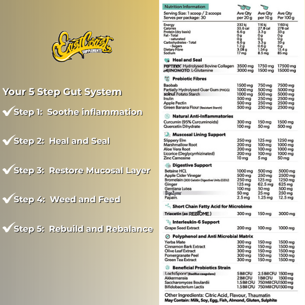 Peptinex Hydrolysed Type I & III Grass Fed and Grass Finished Collagen, and Ajinomoto Japanese fermented L-Glutamine fuel and maintain intestinal wall structure, while Zinc Carnosine supports tissue protection — helping your gut feel resilient and restored.